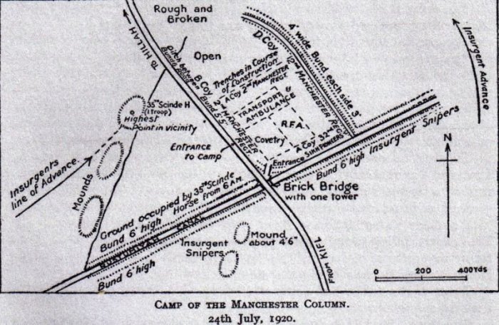 As today, after the Treaty of Versailles on June 28th 1919, there were tensions in the region. Bolshevik forces were active in Persia (Iran) and British forces were stretched by indecision.A series of skirmishes and incidents took place throughout the summer of 1920 and increasing civil disobedience took hold. This is where a certain amount of guesswork comes into play, as I simply have nothing to substantiate how Herbert met his death; but one particular event stands out.The railway at Al Kifl, south of Baghdad, was attacked and the local political officer requested assistance from the garrison at Hillah to restore order. On July 23rd a military force was sent south to assist.This column, now known as the ‘Manchester Column’, contained:35th Scinde Horse – 2 squadrons. 39th Battery Royal Field Artillery – 2 sections. 2nd Battalion Manchester Regiment – 3 companies. 1/32nd Sikh Pioneers – 1 company. 24th Combined Field Ambulance – 1 section. In addition, a transport train brought the total strength to around a thousand.The column commander was Brevet-Lieutenant Colonel R.N. Hardcastle DSO.Before leaving Hillah, Lieutenant Colonel Hardcastle had been under the impression that he was the advance guard of a larger force that would follow his column, and his orders were: “If opposed by large hostile forces, you will avoid becoming so involved as to necessitate reinforcements, and should occasion arise you will fall back on the position you now occupy.”He was unaware that there was no larger force, and his column was alone in increasingly hostile territory.By 24th July, the column reached the Rustumiya Canal at about 1235 hours. The Manchester Regiment soldiers were so exhausted by the extreme heat that the Medical Officer recommended a 24-hour rest period and camp was struck. At 1745 a force of some 3000 insurgents approached the camp. The insurgents advanced at some points to within 150 yards from the camp and fire was exchanged. Real concerns that the column would be surrounded if it remained in place were raised, and the decision to withdraw was made. One company of the Manchesters acted as advanced guard whilst the other two companies marched on the flanks. The transport train followed the first company, followed by the guns escorted by the Sikh Pioneers; the two squadrons of Scinde Horse acted as rearguard. The column headed back towards Hillah after 8pm, as per orders not to engage.