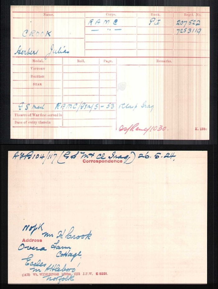 The politics of modern Iraq has its roots in the events of 1920, and the war dead of conflict there have not received a peaceful rest. Control wasn’t really established until 1924, and Britain supplanted a King on the Iraqi people and the nation assumed Protectorate status. Modern history tells a complicated story. Attached in the link below is an article describing the difficulty of maintaining memorials there today:CWGC in IraqSo in conclusion, I accept that I may have extrapolated facts regarding one particular incident to make sense of what little is known of Herbert’s death. But what is certain is he died in enemy hands during the Arab Rebellion of 1920. The story of how he found himself attached to an Indian Division in the Middle East, like his body, is sadly lost to history. As a final sad footnote, his medal card below shows that his award of the India General Service Medal with Iraq Clasp, was sent to his family almost four years after his death and 18 months after the death of the mother who mourned him.