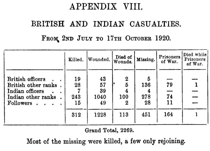 The picture is undated, but information suggests the men were incarcerated from July 28th until their release on or around October 19th 1920 as per the above conversation in Parliament. I have no idea if Herbert is among those faces looking back at the camera. I hope he is, because it gives me a shred of consolation that at least for one moment in his captivity he was not in fear for his life, or alone.It may be Herbert died of wounds or disease, or less likely he may have been one of the unfortunates, marched off to Najaf and murdered in retaliation for the mistreatment by the British in other events, but this seems unlikely as it is suggested that the men held at Najaf were treated well. I have found no definitive report of British prisoners being executed by their captors, and there is only allusion to how they may have been mistreated when first captured. Reflections on their situation compared with modern events involving ISIS captives is the stuff of nightmares; I have only my imagination on the thoughts of those men as they fell into enemy hands. And because of this, unlike his brother Sidney killed by shellfire, there is the thought that Herbert had time to contemplate his fate.Research on British Prisoners of War in the revolution has proved difficult, with very few facts available. The Manchester Column incident seems to be the only incident where a significant number of prisoners were taken, so it seems likely Herbert was involved. In any case, he was dead at least two months before Winston Churchill updated Parliament on the fate of the known POW’s. I suspect we’ll never really know what they went through.The main available authority on the campaign is “Insurrection in Mesopotamia” by Lt General Sir J Aylmer Haldane which, when published in 1922, had the below appendix. It leads to one more heartbreaking discovery about Herbert.If these figures are accurate, and the CWGC reports are true that Herbert died a prisoner of war, the records suggest that he was the only British soldier to die while detained by rebel forces. I find that both sad and horrifying. While the narrative talks of missing men, and also of others being summarily executed at Najaf, Herbert’s available facts are explicit that he died a POW. Shockingly unique if true.The insurrection, which lasted to October, was crushed by harsh military retribution including allegations of war crimes by the RAF bombers against civilian populations. A blog by Christopher A Lawrence explains the revolt and subsequent casualty figures in the link below, but largely relies on Haldane.Further Reading HereSo, after a century of turmoil in Iraq, and in the sands of long forgotten military history, Herbert Crook has no known grave and is commemorated on the Basra Memorial. Najaf is famous for its Wadi Al Salaam cemetery; the largest civil cemetery in the world. It is ancient and contains multiple millions of burials. Maybe Herbert was taken there, or maybe some other plot for non Muslims.The memorial itself, like Herbert, now lies ‘lost’ in the desert, having been moved from its original position at Basra port in 1997 by Saddam Hussein, to location 1km off Highway 1 on the road to Nasiriyah.