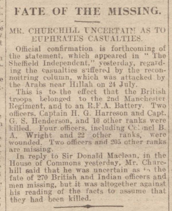 It was not long before chaos ensued, as the retreating column in part panicked and became disoriented in the dark. A summary is encapsulated by this account of a Victoria Cross award to Captain George Stuart Henderson DSO, MC & Bar, 2nd Bn Manchester Regiment. The citation for his posthumously awarded VC states:“Shortly after the company under his command was ordered to retire near Hillah, Mesopotamia, a large party of Arabs opened fire from the flanks causing the company to split up and waver. He at once led a charge which drove the enemy off. He led two further bayonet charges, during the second of which he fell wounded but struggled on until he was wounded again. ‘I’m done now. Don’t let them beat you!’ he said to an NCO. He died fighting.”Order was eventually restored by a combination of bravery and superior firepower. The Commander-in-Chief later wrote:“The officers of the 39th Battery and those of the cavalry behaved like heroes and it is thanks to their fine example and the discipline of those under their command that a complete disaster was averted.”The final medal roll for the action would be a Victoria Cross, two Bars to the Military Cross, two Military Crosses, a Bar to the Distinguished Conduct Medal, two Distinguished Conduct Medals, five Military Medals, two Indian Orders of Merit and two Indian Distinguished Service Medals.The story of the action is here: Henderson VCHowever, some of the Manchester’s and other parts of the column became lost in the dark and fell into the hands of the Arabs. Some were killed immediately whilst others were taken prisoner.Newspapers began to report the disaster within a fortnight, with varying accounts. Research shows differing numbers, but the best casualty summary I could find states:“20 men killed, 60 men wounded and 318 missing. Only 79 British and 81 Indian missing soldiers were later released by the Arabs (and some of these had been captured previously), so the count of men dead was in fact over 180. The 1/32nd Sikh Pioneers lost 30 men killed; being non-Muslim they stood little chance of survival if captured. The Manchester Regiment lost 3 officers and 131 NCOs and men killed; it is believed that around 100 prisoners from the Manchester Regiment were taken to Najaf and killed there.”
