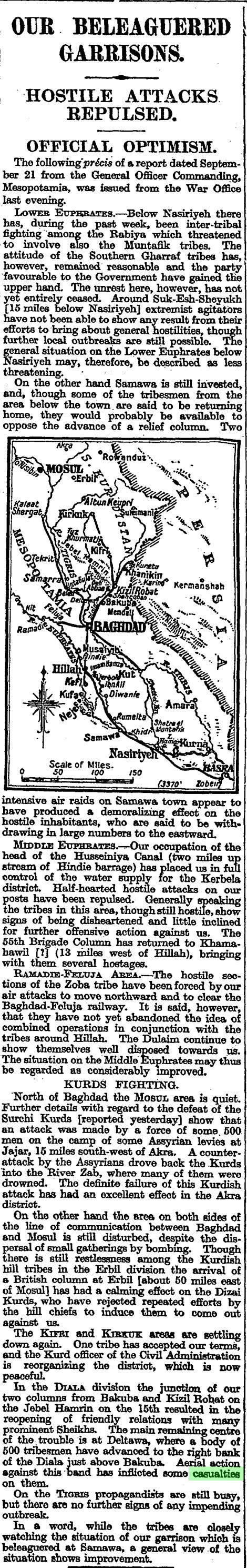 No important news regarding the attack on Hillah has yet been received. A reassuring telegram has been received from the General Officer Commanding, Mesopotamia, with regard to the British prisoners taken in the recent operations. It appears that though they were very much neglected at first they are now receiving better care, and that the Army leaders have issued communiqués stating that the Arabs look on prisoners as a sacred trust and ordering the subordinate sheikhs to treat them well. The prisoners are said to be collected in the neighbourhood of Nejef. A friendly local doctor from Baghdad has been sent to them with clothing, comforts, and medicines under conditions which are expected to ensure his safe arrival. A list of the prisoners captured was asked for and will be telegraphed when obtained. General Haldane wishes the relations of the prisoners to be assured that their welfare is receiving the most earnest attention, and that every effort will be made to maintain touch with them and to secure good treatment.