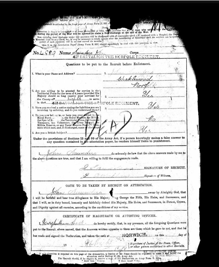 John ended up in 1/4th Battalion, The Norfolk Regiment as Private 4989, then was issued service number 201142. However, John isn’t a straight forward story. His service records partially survived the blitz. In August 1915 his records show that he forfeited 31 days ’embodied service’ for fraudulently enlisting with the Norfolks while ‘belonging to the RFA.’ He used the name John Smith. So maybe all three cousins did stand in line in Norwich and join the Army. Quite why John then swapped regiments by using a false name is unknown.