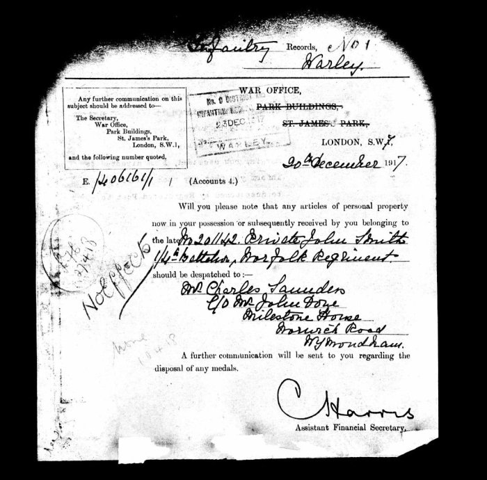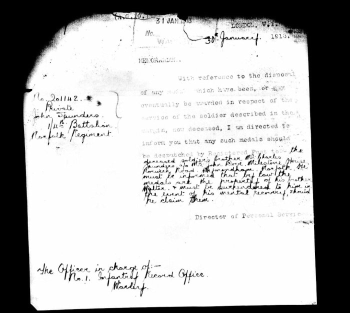 The papers list the correspondence over his affairs, and reference that his brother Charles would receive his medals on behalf of his brother Walter who was by 1921 a resident of Thorpe Asylum (St Andrews Hospital). I know that in 1911, Walter was a farm labourer lodging at Hackford.