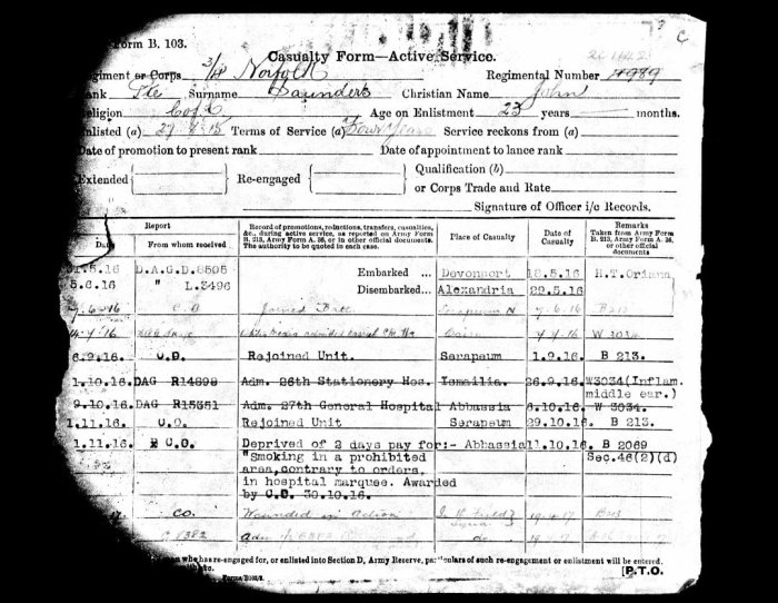 Above are the remaining papers of John’s service file. He may have gotten off on the wrong foot with the army by switching names, and getting caught smoking is a bit daft, but he probably had a rough time of it in the dreadful conditions of Egypt and Palestine. Certainly, his was a rough war in an alien environment.