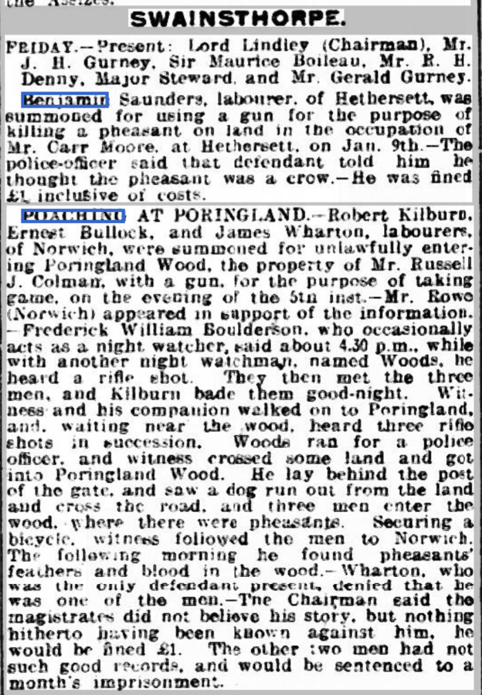 Ben Saunders was my maternal great grandfather, and born in May 1881 at Snetterton. Mum has long told me that Ben had been born and raised as a Burlingham, but the story goes that his grandmother Hannah told him before his wedding day that he was in fact a Saunders, because she couldn’t allow him to marry under a lie (Ben’s mother Caroline was born out of wedlock before her parents married).