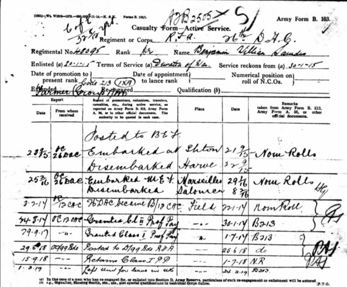 I don’t intend from this point to go into great detail about the war of the three comrades, but in summary, all would disembark by the autumn of 1915.Ben would head for France on 22nd September 1915, then by early 1916 to Salonika with 26th Division Ammunition Column, then serve out the war with 99 Brigade/22 Division, and get malaria for his troubles.
