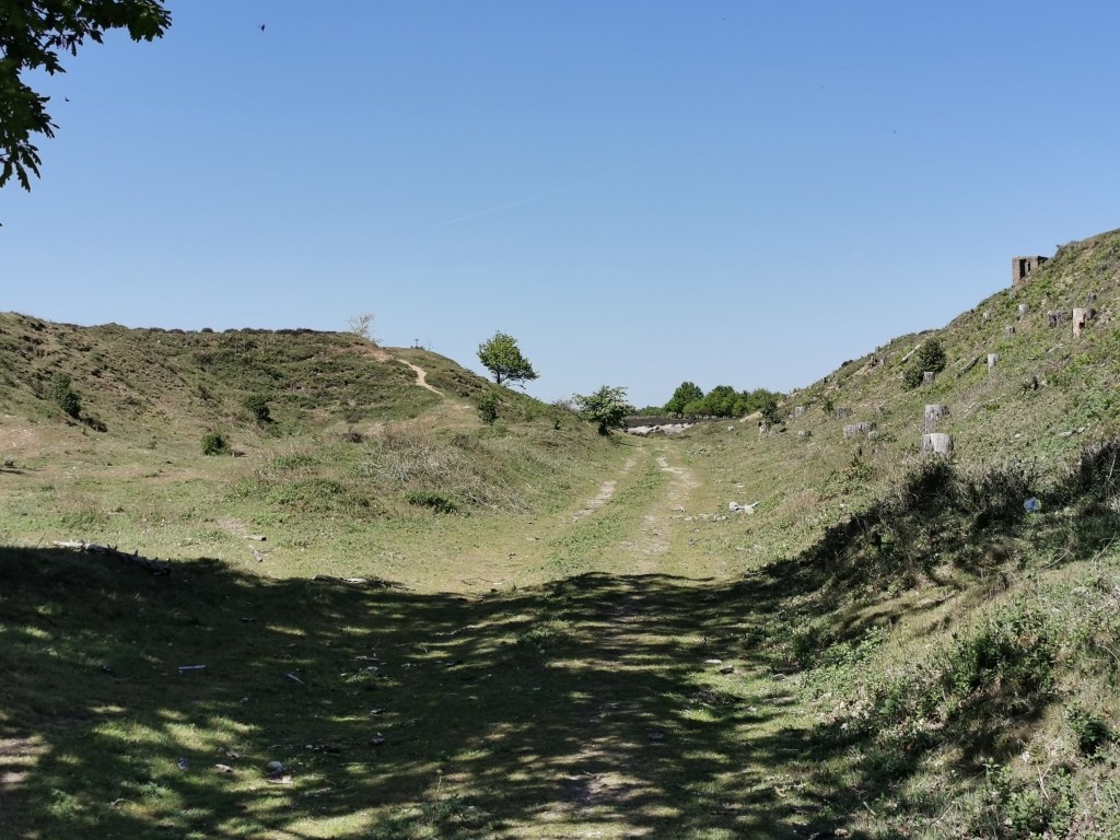 Following the many trails around the quarry leads to an obvious exit and entry to the Tony Hallatt Memorial Reserve at the bottom of the Warren closest to the Lynn & Fakenham Line. Within the quarry, there’s the odd discarded rail laying about, but most has been reclaimed for scrap. You can see a clearly man-made embankment travelling down slope towards the junction hidden in the trees, and here you’ll find the remaining tramway still shows itself in the ground.