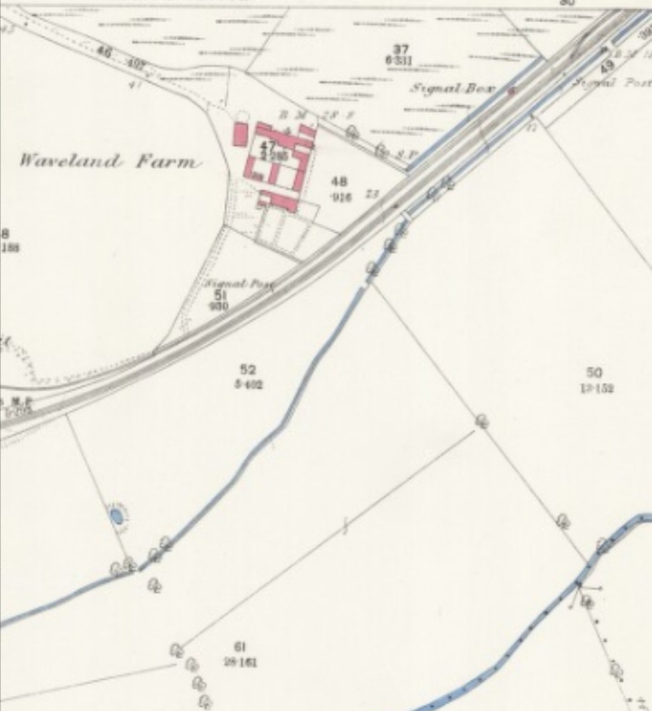 There’s nothing left on the ground to show you the sidings and junction, or the signal box that stood here. The pictures below show the junction and the line from Gaywood joining to the right. Even Waveland Farm is long gone; it was occupied at least until 1939, but you’d never know it existed now. It’s a quiet, remote green place, only interrupted by the sounds of nature. It’s difficult to envisage an industrial scene of 130 years ago.