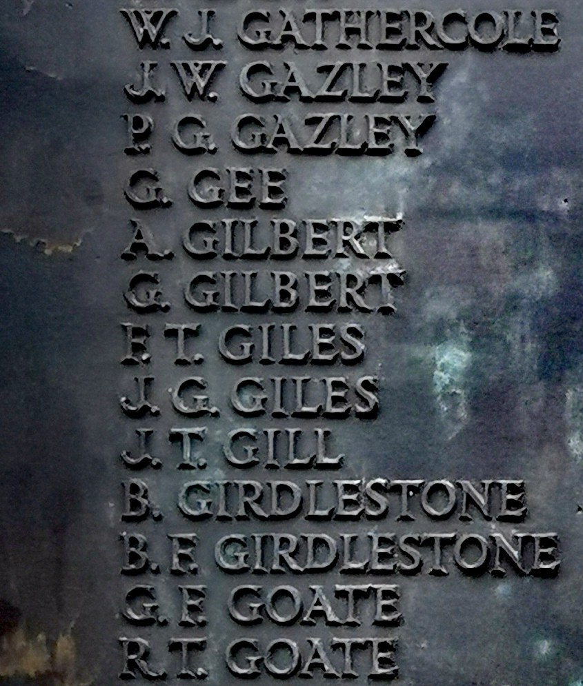 Percy Gazley is remembered on the town war memorial at Tower Gardens, along with other members of the Gazley and Goate families.