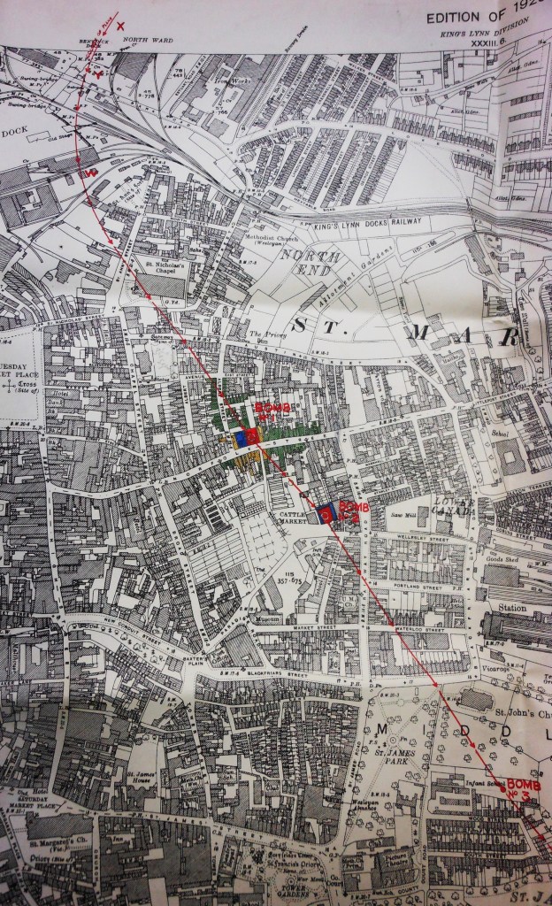 L4 dropped eight bombs on Lynn, beginning in the vicinity of Tennyson Avenue railway crossing, reportedly at the rear of Park Avenue and on allotments near the recreation ground; then Bentinck Street (where the swimming pool is now), East Street/Albert Street (behind The Eagle pub in the now Albert Street carpark), on to the rear of St Ann’s Street and the Alexandra dock with the final two falling on and near 63 Cresswell Street as they departed. Unbeknown to the crew of L4, they’d come perilously close to striking a genuine military target in the fledgling wartime aviation industry at Savage’s St Nicholas Ironworks, but that’s another story.