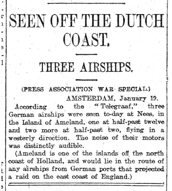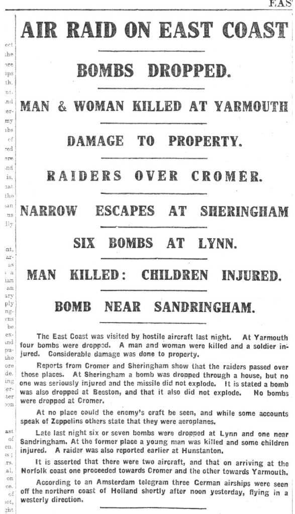 The late edition of the Eastern Daily Press of January 20th reported extensively on the Zeppelin raids that night: