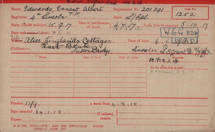 We see that Ernest left a widow, Alice, and marriage records show that Ernest married Alice Swinger at Gedney in May 1915, corresponding to our belief that he enlisted at Spalding in late May 1915 – therefore Ernest and Alice tied the knot, as so many did, just before he went off to war. They had no children.
