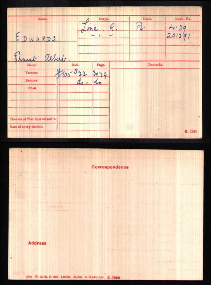 201812 Frank Thornley, and 201792 Ernest Everton are both also recorded as of ‘B’ Company, presumably comrades of Ernest; Frank is also on the Red Cross missing enquiry list for the same date as Ernest Edwards. Perhaps all three were standing next to each other when the mortar struck them as they waited for the SOS flare. Maybe they survived the initial onslaught and were killed as they attempted to fight their way out of the railway cutting or in the several hours of hand to hand fighting that took place in enemy lines just beyond it.