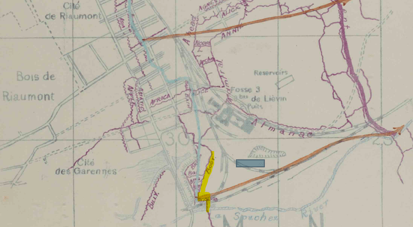 The above Brigade narrative and maps of the Lens sector show the action of June 8th, in which 1/4th Lincolnshires were involved as the left-hand battalion and with the 5th Leicesters to their right, at Cite de Riaumont in Lievin. The action was an assault on enemy positions at Fosse 3 and Hill 65, with a Zero Hour of 8.30pm. The assembly trenches in which Ernest likely died in square M.24.C are in what was the brigade boundary shown as Absolom Trench, and now roughly between the modern Rue Breguet & Rue Legendre. Their objectives were enemy lines across the railway cutting that is now the dual carriageway D58. Reading this information seemed far more likely to be a source for the action and place of death of Ernest than anything else written by the 2/4th Battalion. I then found the following account: