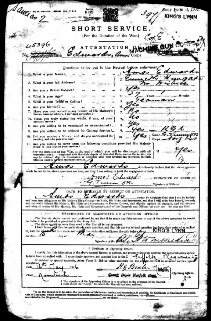 As can be seen, we have more luck with Amos because his service file survives, but less luckily for him this is where the family tales begin to unravel. We’ll never know if they were tales told in jest, or whether they were simply told to wide-eyed children desperate for tales from the battlefield; but should you peruse the details recorded when he enlisted at King’s Lynn on May 15th 1916 you’ll note that Amos has a scar listed on the left side of his head, and two on his right hand…..