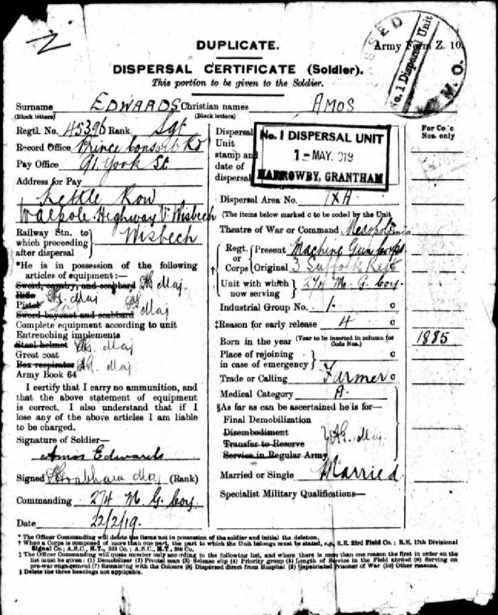 Amos Edwards was born at Ely, Cambridgeshire in 1889, and his younger brother at nearby Prickwillow in 1891 – two of eight children to Amos and Helen Edwards. Around that time Amos Snr was a farm labourer and the family lived at Middle Fen Bank near Ely; then Burnt Fen, Prickwillow – that Fenland hinterland out in the nowhere between where the three counties of Cambridgeshire, Norfolk and Suffolk merge in the black peatlands.