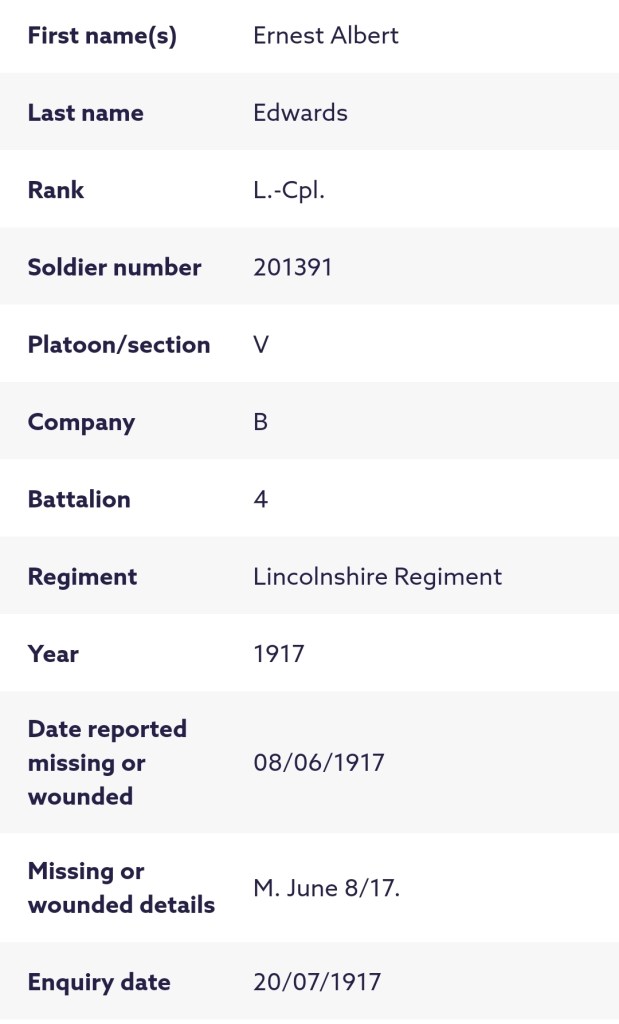Above is the Red Cross & Order of St John ‘Wounded & Missing’ record showing L/Cpl 201391 Ernest Albert Edwards, of Platoon V Company B, 4th Battalion Lincolnshire Regiment, was recorded as missing on June 8th 1917, and that an enquiry was made to see if he had been identified as a casualty or Prisoner of War. The additional detail here of Platoon and Company will prove helpful as we shall see.
