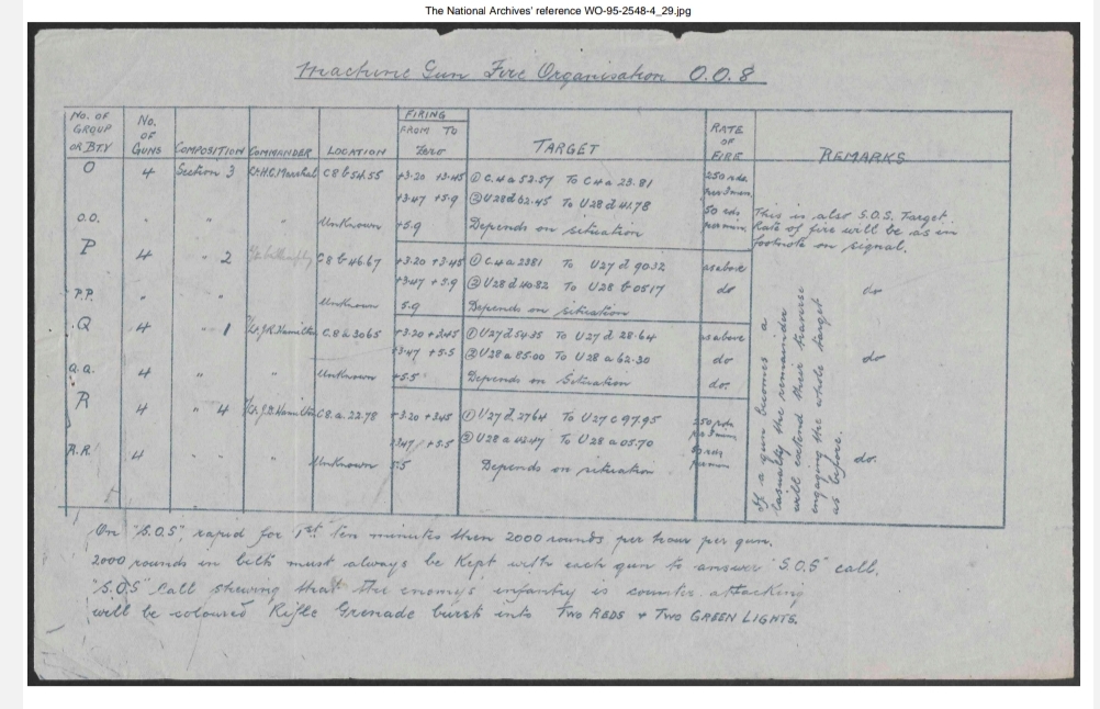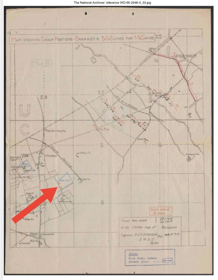 Being a Machine Gunner, I was able to show from their, as usual, detailed diaries that when Amos was separated from 176th MGC in October 1917 he belonged to No.2 Section, and from that and thanks to their records, able to give the family a position for Amos and the guns at the start of 3rd Ypres; at Pilkem Ridge just north of Marsouin Farm firing on Iron Cross. They now have a much clearer picture of what a man in a machine gun company would have gone through and the importance of the role to infantry units.