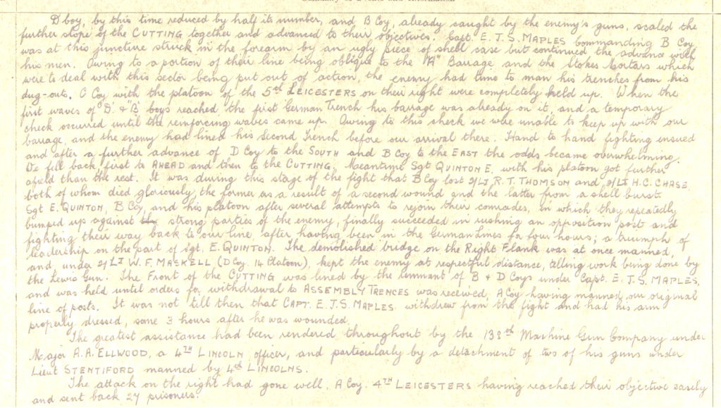 The full 1/4th diary entry above spells out the bitter fight that ‘B’ Company faced – having been badly beaten up in the assembly trenches, they fought their way out of the railway cutting into enemy ground, before being eventually beaten back by artillery fire and hand to hand fighting from Ahead Trench back into the railway cutting. Somewhere amongst all this sits my hypothesis for the final moments of Ernests life.