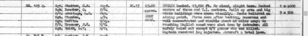 EE105Q Sgts C.S.Chatten, C.Baumber, P/O L.R.Armitage, Sgts Standen, W.A.Reffin, F/Sgt J.R.Kraemer, Sgt L.V.Smith. 1 x 4000lb, 9 x 500lb. Up 2015 Down 0300 (approx – shot down). Berlin bombed. 19,000′. No cloud. Slight haze. Bombed centre of three red TI markers. Built up area and big white buildings were seen visually. Bombs believed on aiming point. Fires seen after bombing, numerous and well concentrated and visible about 40 miles away. On reaching English coast were shot down by an intruder. All safely baled out except mid upper gunner who was killed. Captain received leg injuries. Aircraft a total loss.”
