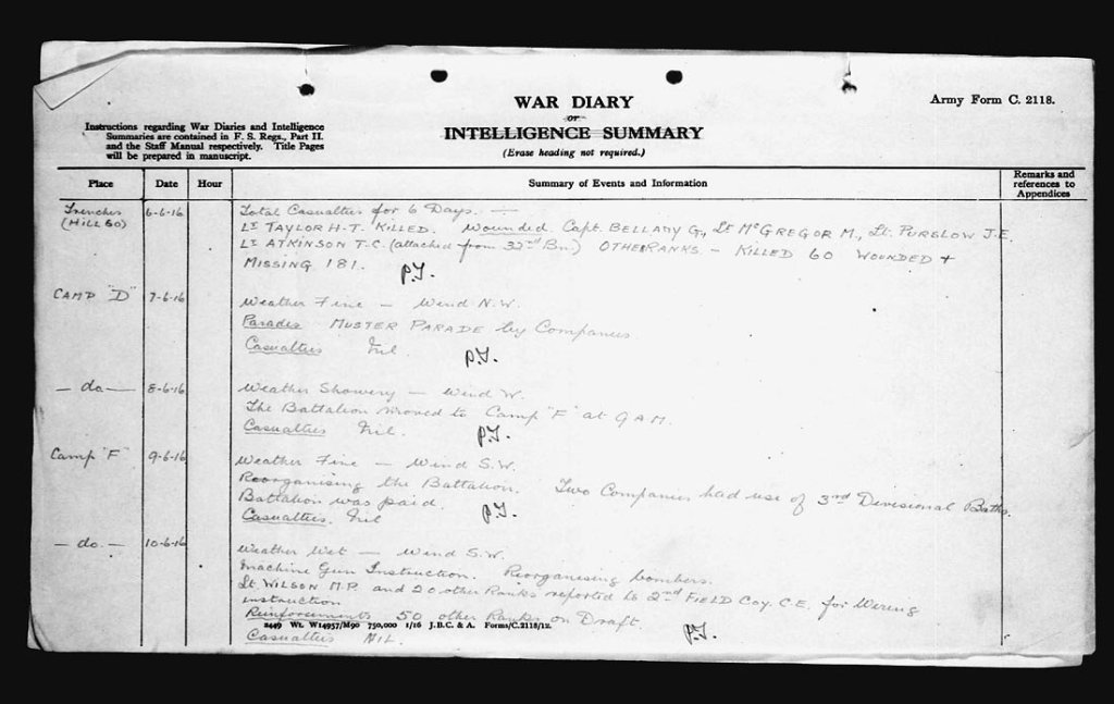 When you read the war diaries of the 5th Battalion, you will see that they are unfailingly neat and concise. The authors followed a precise edict to avoid giving away too much information about locations and when in the trenches invariably use grid references and trench numbers rather than place names. Equally, the prevailing weather is always described, giving colour to otherwise dour reports.