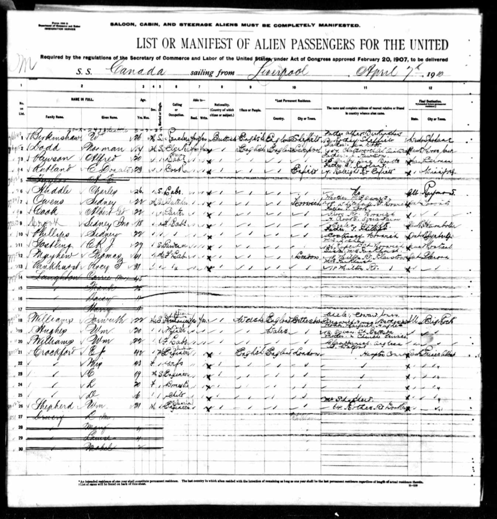 Sydney was 18 years older than my grandfather. By the time my grandfather was born in October 1910, Sydney was on his way to Saskatchewan as a farmsteader, following the lure of the Dominions Lands Act and the offer of the chance to strike out on his own. He sailed to Portland, Maine from Liverpool on 7th April 1910 arriving on 16th April. His occupation was given as ‘farm labourer’ and his destination Humboldt Saskatchewan. His religion was given as ‘non conformist.’