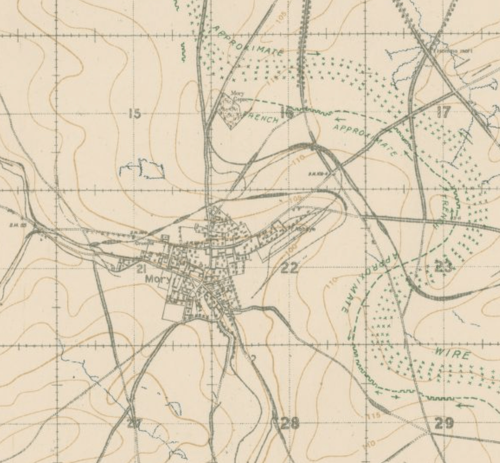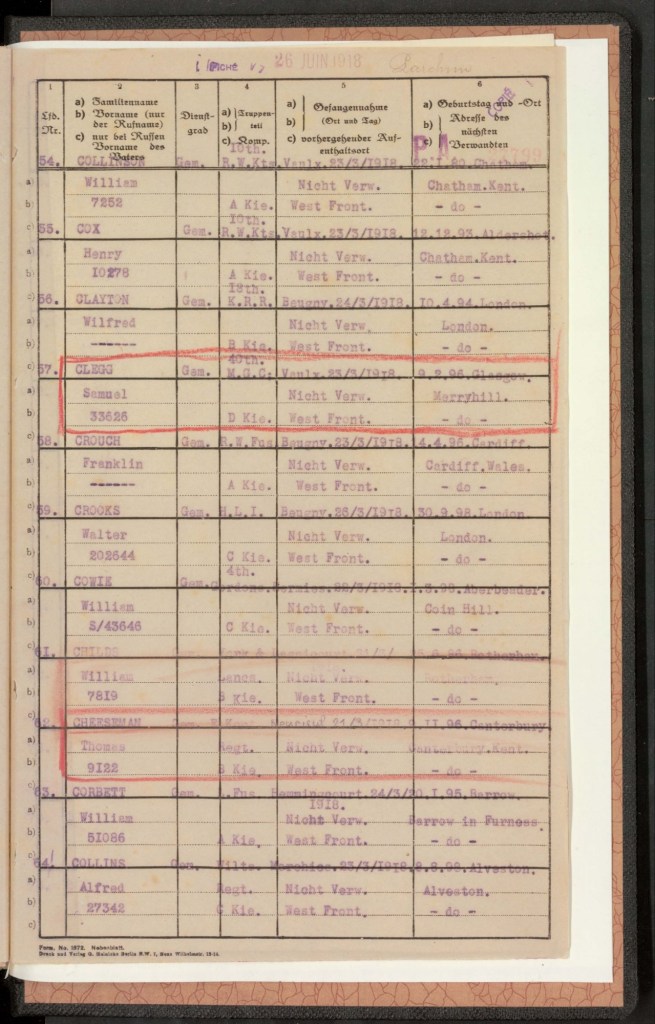 The additional details are that he was attached to C company and fell into enemy hands at Beugny, which is further east on the Cambrai road than where they’d been fighting; so I suspect he was marched out behind enemy lines before being formally handed over to the German authorities. The records show a date of capture of 25th or 26th March. The German record also suggests Walter had an injury to his right arm – “G.G. Recht Arm” apparently translates as “gewehr geschoss” or rifle bullet right arm.