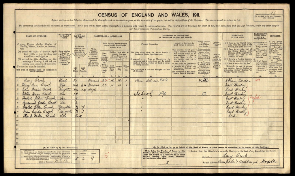 Walter was the sixth child of my great grandparents Harry and Mary Crook, and was born on 30th September 1898 at East Harling, Norfolk.