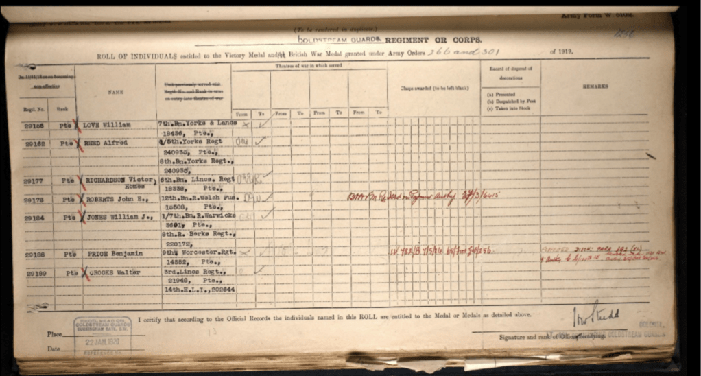 At war’s end, Walter wasn’t finished and transferred his allegiances to the Coldstream Guards, attesting at Cupar, Fife on May 9th 1919, hence being on their medal rolls.