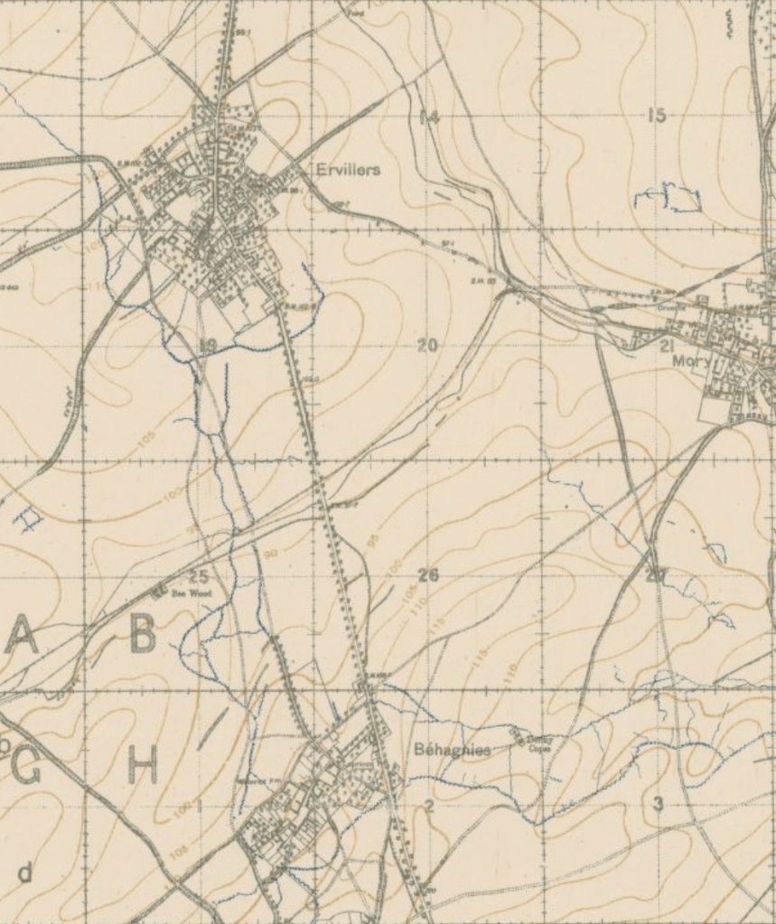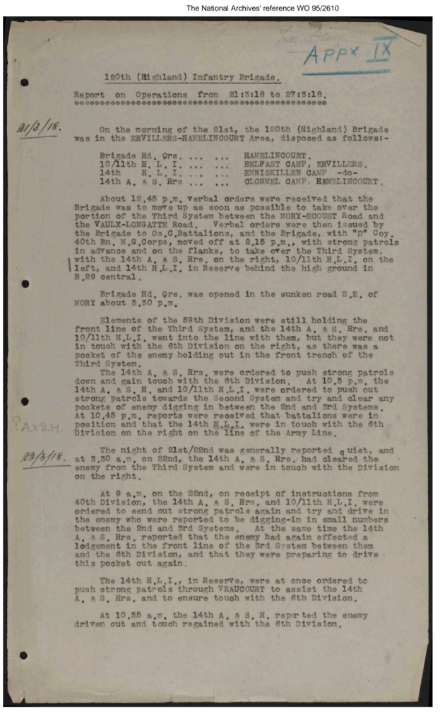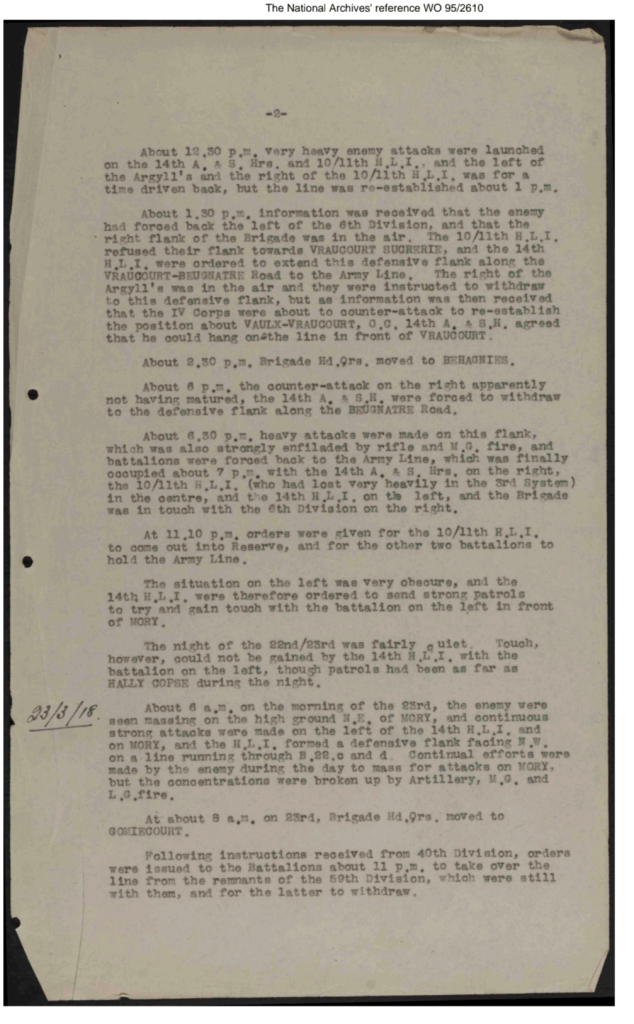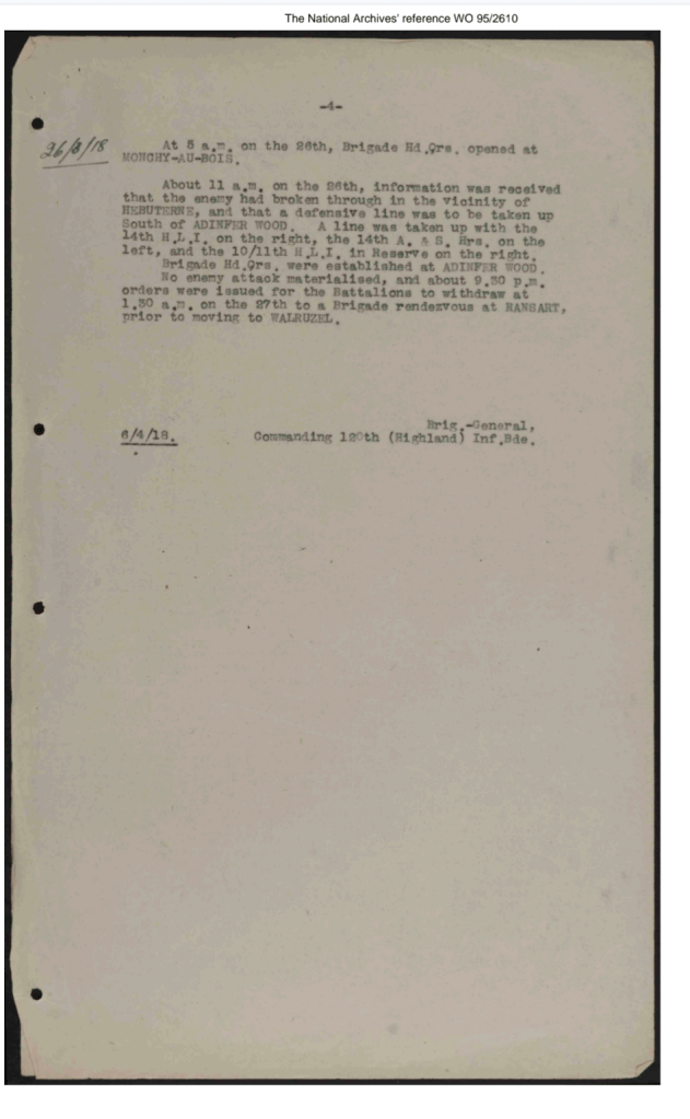 At the beginning of the German counter offensive known as ‘Operation Michael’ in March 1918, the 14th HLI found themselves near Mory, north of Bapaume. On March 25th they were falling back from Mory towards Béhagnies and Ayette. Almost overrun, with the line collapsing on their right and in retreat, it is during this period that Walter was taken prisoner. The war diaries suggest that the 14th had 124 ‘other ranks’ missing in that period, and the Brigade diary expanded that number to 466 men missing.