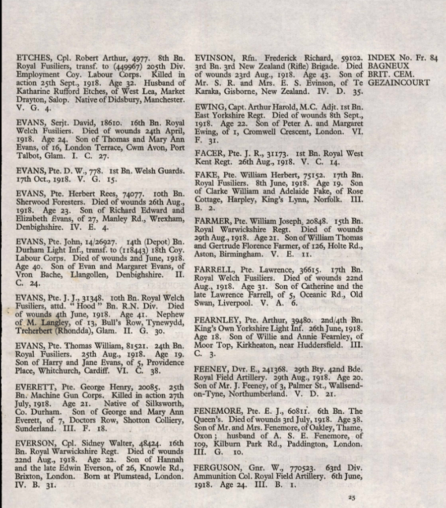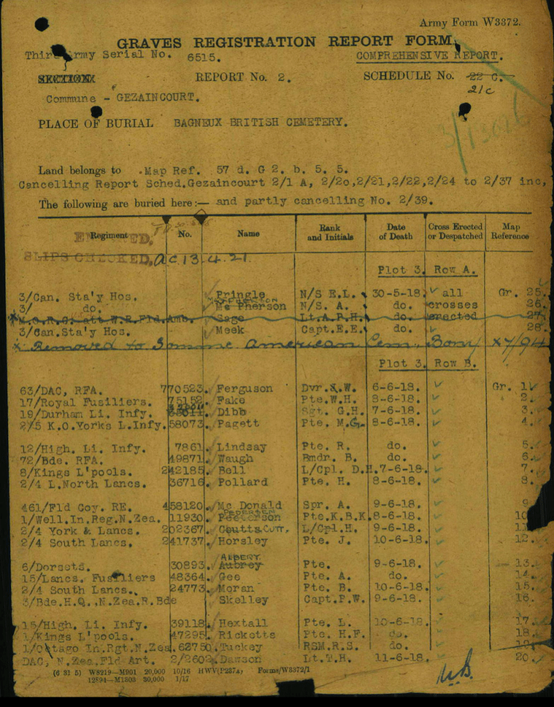 What the casualty records from the 5th Field Ambulance show is that at some point, possibly late on 6th June, or on the next day Will Fake received a gunshot wound to the head. How soon after arriving in the line he was shot isn’t clear, but he was then evacuated to a Casualty Clearing Station at Gezaincourt where he died of his wounds on June 8th.