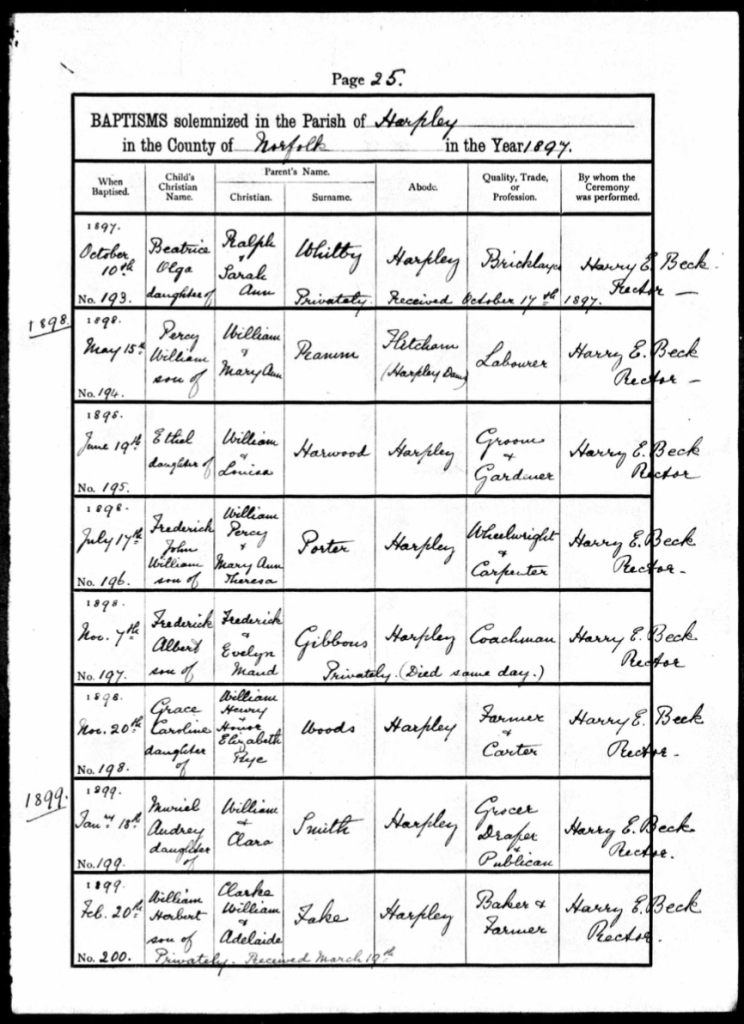 William Herbert Fake was baptised at St Lawrence’s Church, Harpley on 20th February 1899. Harpley is one of those pretty little villages out between King’s Lynn and Fakenham and lies on the fringes of Houghton Hall estate.