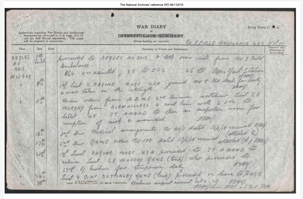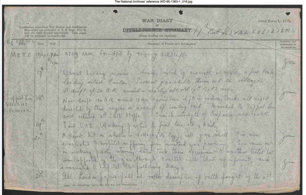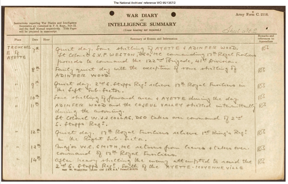 The medal records are often helpful in giving us a date for when a man arrived in a theatre of war, and in this case we can see Will embarked to France on 15th February 1918. Looking further into the war diaries of the 17th Battalion, we can see that a draft of 30 men arrived on Sunday 17th February and another larger draft of 130 men on the following day; so we can be reasonably confident that Will’s first experience of life on the western front was in the support trenches at Villers Plouich on the Somme battlefield.