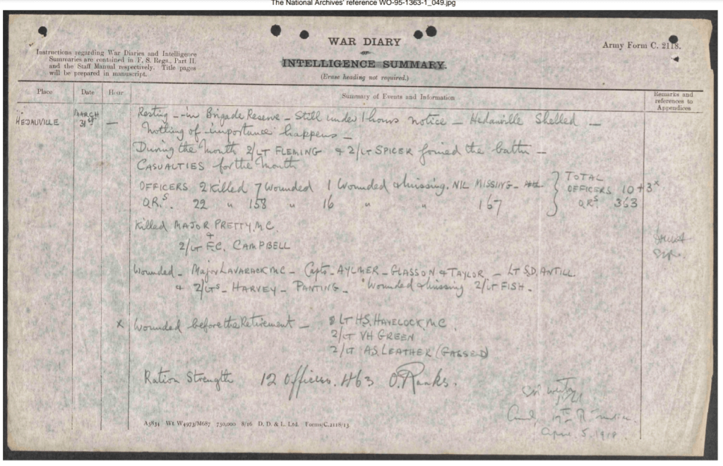 The final extract from the March 1918 diary gives casualty figures of over 370 men of all ranks for the month, of which 167 were missing. It had been a tough baptism for Will.