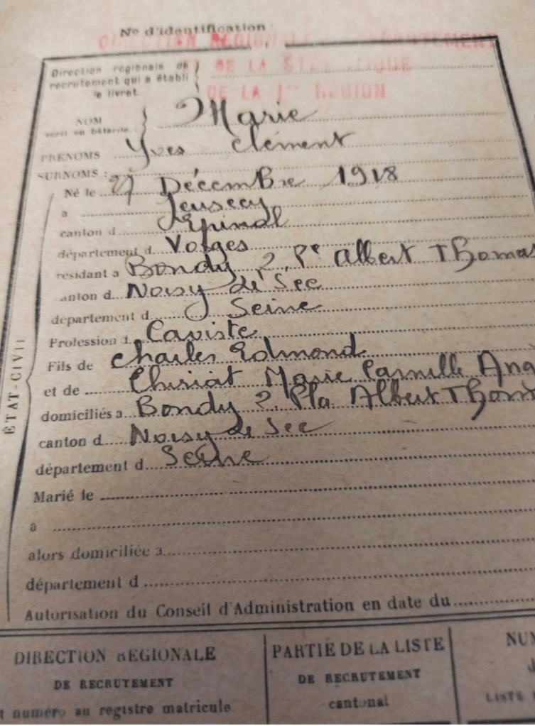 Yves was recruited at the start of the Second World War as evidenced by the document below.