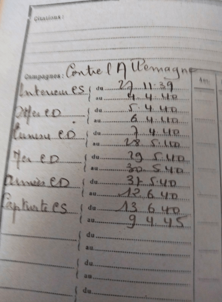 The two following documents detail Yves’ military path. Yves was recruited on November 15, 1939. He embarked for Marseille on April 5, 1940 and disembarked in Tunis on April 6. He embarked in Bizerte on May 29 to return to Marseille on May 30.
