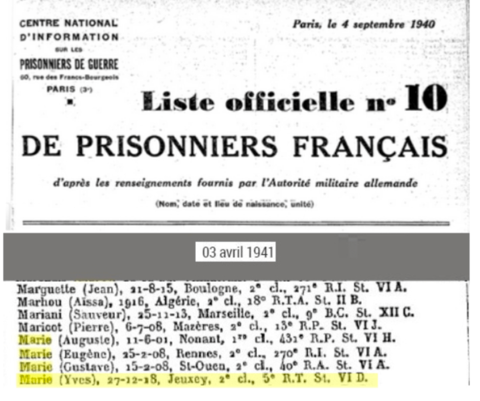 The list of French prisoners confirms the presence of Yves at Stalag VI D (Family name followed by forename, date and place of birth, rank, unit and location):