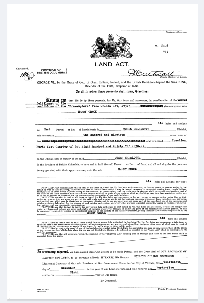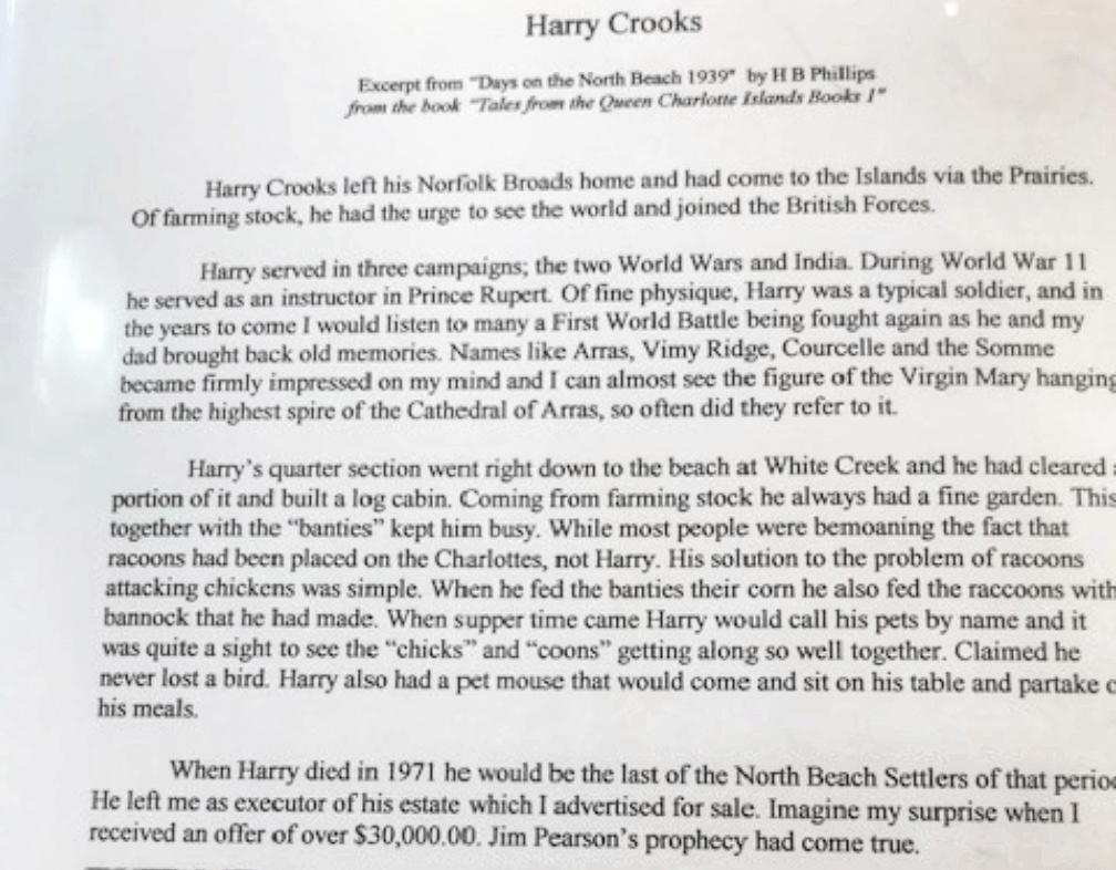 If you’ve followed Harry’s story you’ll recall that he ended his days living near the tiny village of Massett, situated on the northern tip of Haida Gwaii – previously known as Graham Island and part of the Queen Charlotte islands on Canada’s Pacific northwest coast – almost as far as you can get from the farmlands of East Anglia. Harry lived there into his 81st year and until his death in hospital in Vancouver.