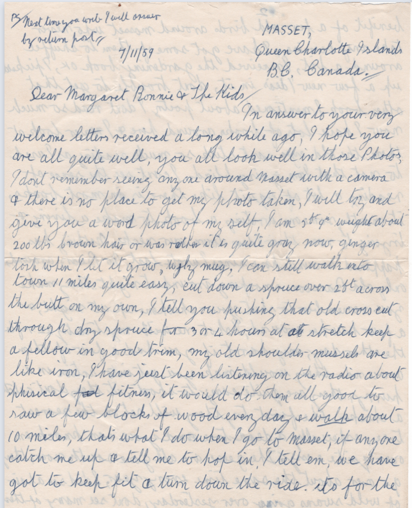 Other than a few scratchy letters he’d written to his niece Margaret many years ago, I had little insight into his solo life at Massett, but today that changed.